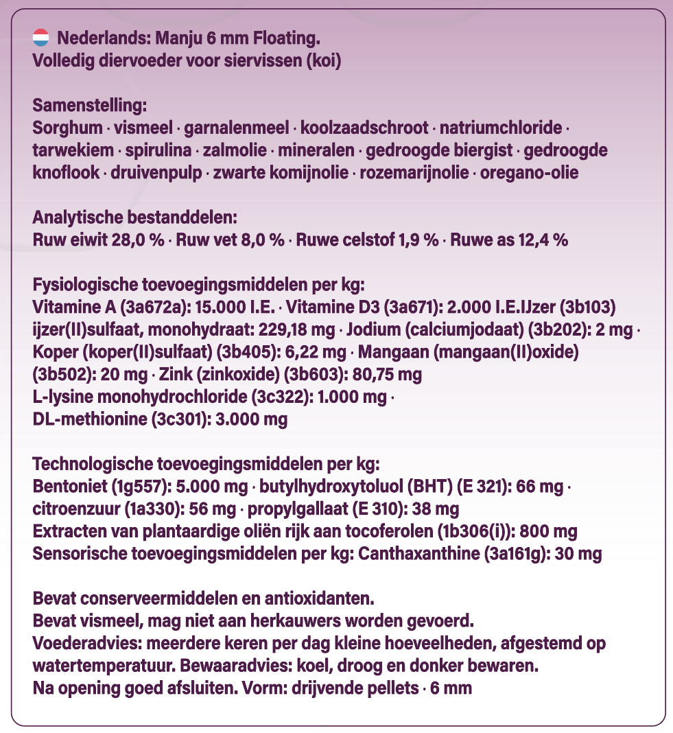 Manju is ontwikkeld om koi op een verantwoorde manier door koude waterperiodes te begeleiden. Het eiwitgehalte is met 50% verlaagd, waardoor het voer licht verteerbaar is. Het spijsverteringsstelsel wordt minimaal belast wanneer koi minder actief eten. De beschikbare energie wordt zo optimaal benut voor behoud van conditie en weerstand, in plaats van groei.